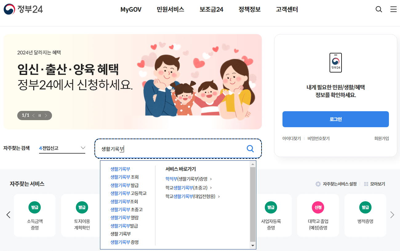 ① 정부24 사이트 방문합니다. 생활기록부는 자주 이용하는 서비스가 없어 검색창에 별도로 "생활기록부"를 입력합니다.