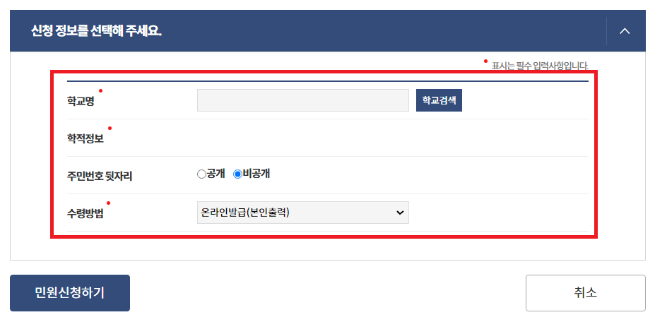 ⑥ 마지막으로 학교검색, 주민번호 뒷자리 노출여부, 수령방법 선택 후 민원신청하시면 됩니다.
