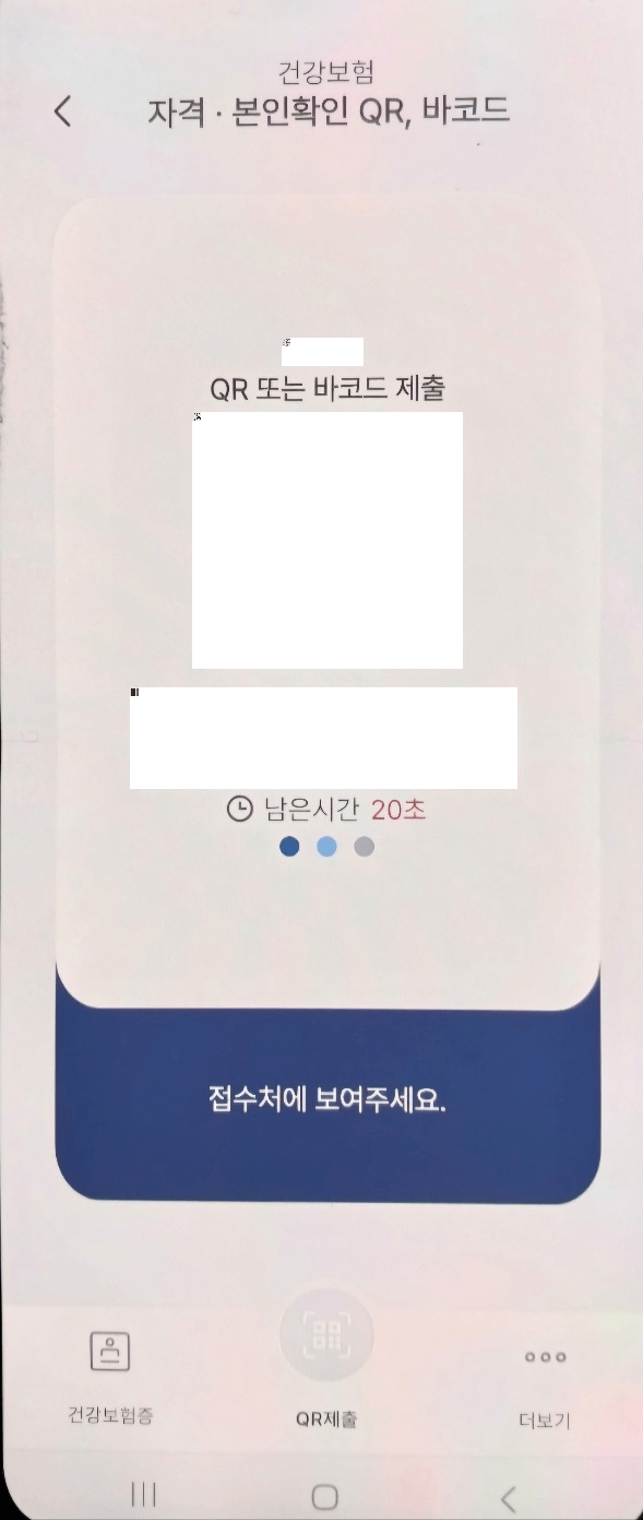 4️⃣ 본인인증을 완료하면 아래와 같이 모바일 건강보험증이 발급이 완료됩니다. 병의원 방문 시 "QR제출"을 클릭하여 제출하시면 됩니다. 발급까지 난이도가 높지 않아 손 쉽게 발급 받을 수 있습니다.