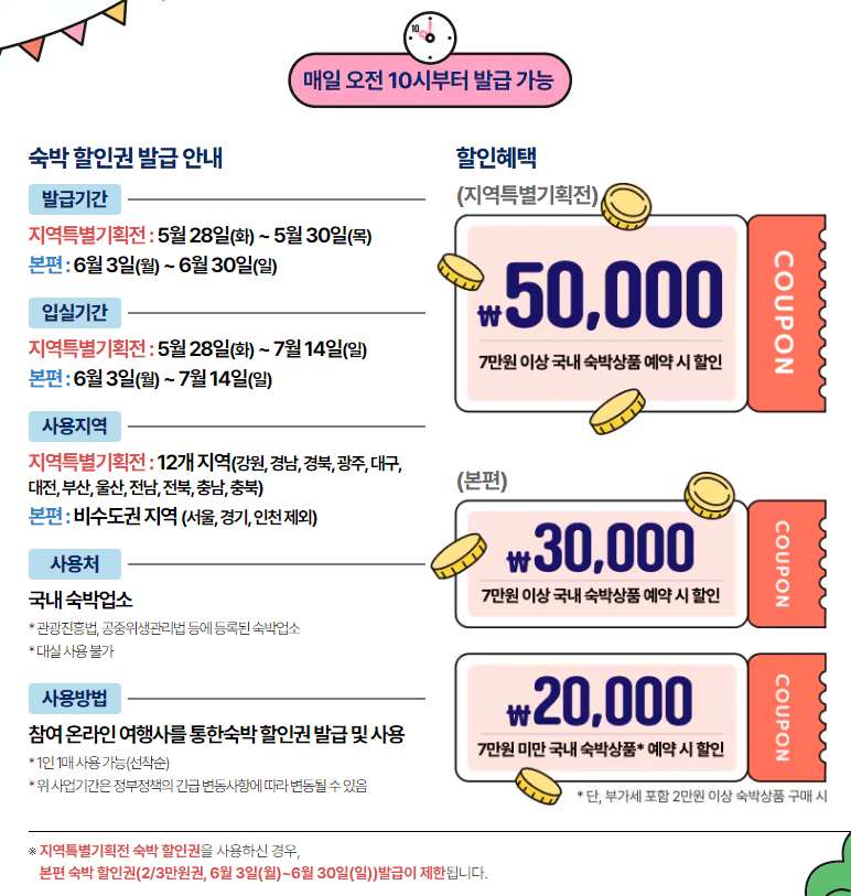 2024년 대한민국 숙박세일페스타 쿠폰은 5월 28일(화) 10시부터 매일 다운로드 받을 수 있습니다. 선착순으로 지급되니 아래 링크를 통해 서둘러 신청하세요.
