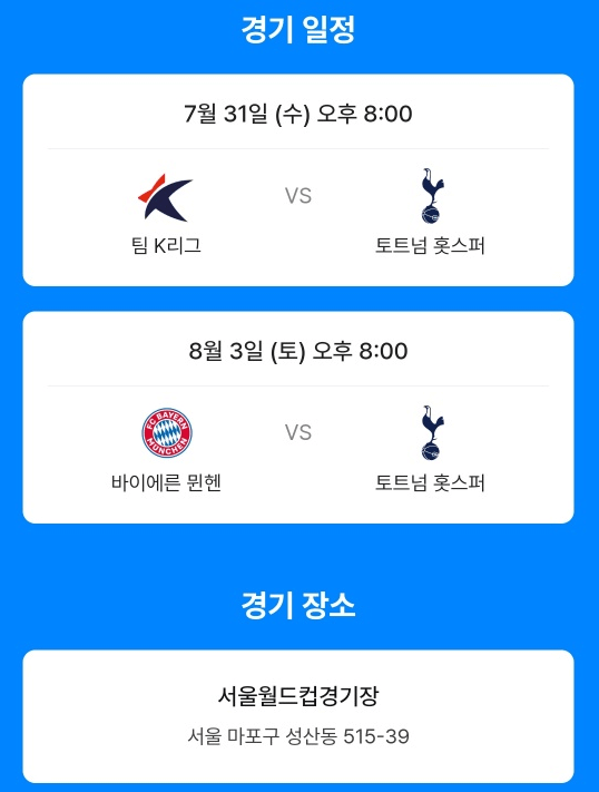 ⏩ 토트넘 뮌헨 경기는 8월 3일(토) 오후 8시에 상암월드컵경기장에서 진행됩니다.