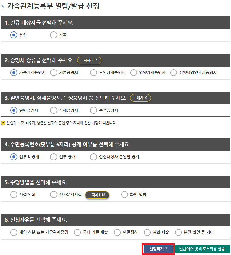 ⑥ '인증'완료 후 1)발급대상자 2) 증명서 종류 3) 일반/상세/특정증명서 여부 4) 주민등록번호 뒷자리 공개여부 5) 수령방법 6) 신청사유를 선택 후 신청하기를 클릭합니다. '직접 인쇄'의 경우 프린터로 출력하거나 PDF로 변환하여 사용처에 맞게 사용하시면 됩니다.