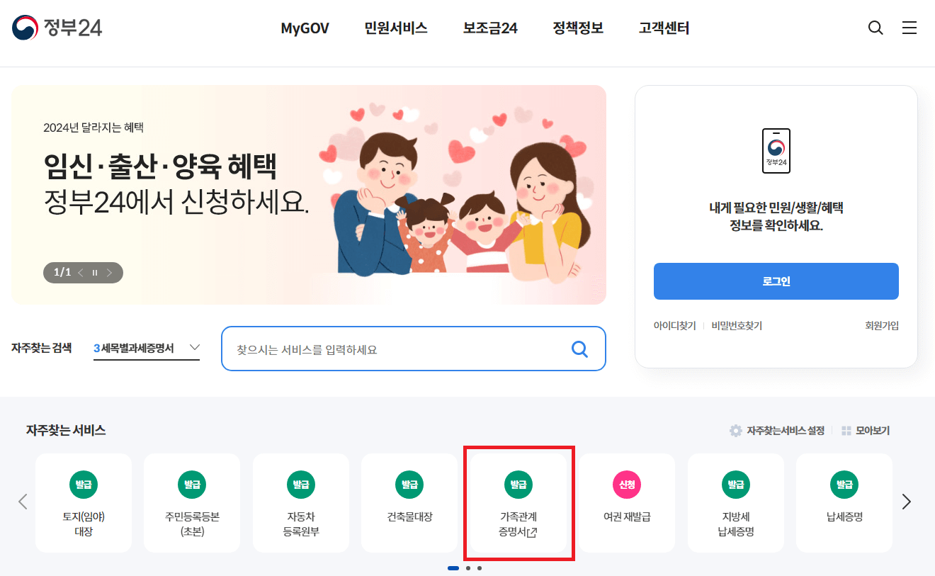① 정부24 사이트 방문하기 후 중간에 '가족관계증명서'를 클릭합니다.