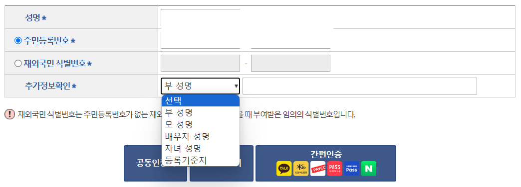 ④ 신청인 성명, 주민등록번호 및 추가정보확인 입력합니다. 추가정보확인의 경우 입력하기 편한 추가정보를 입력하시면 됩니다. 저 같은 경우 '부 성명'이나 '배우자 성명'을 입력합니다.